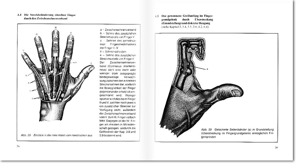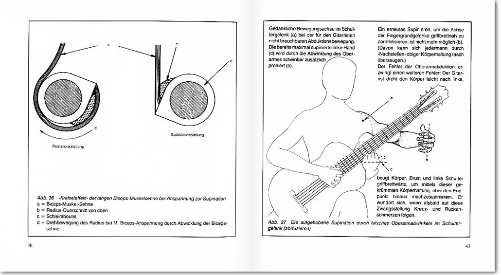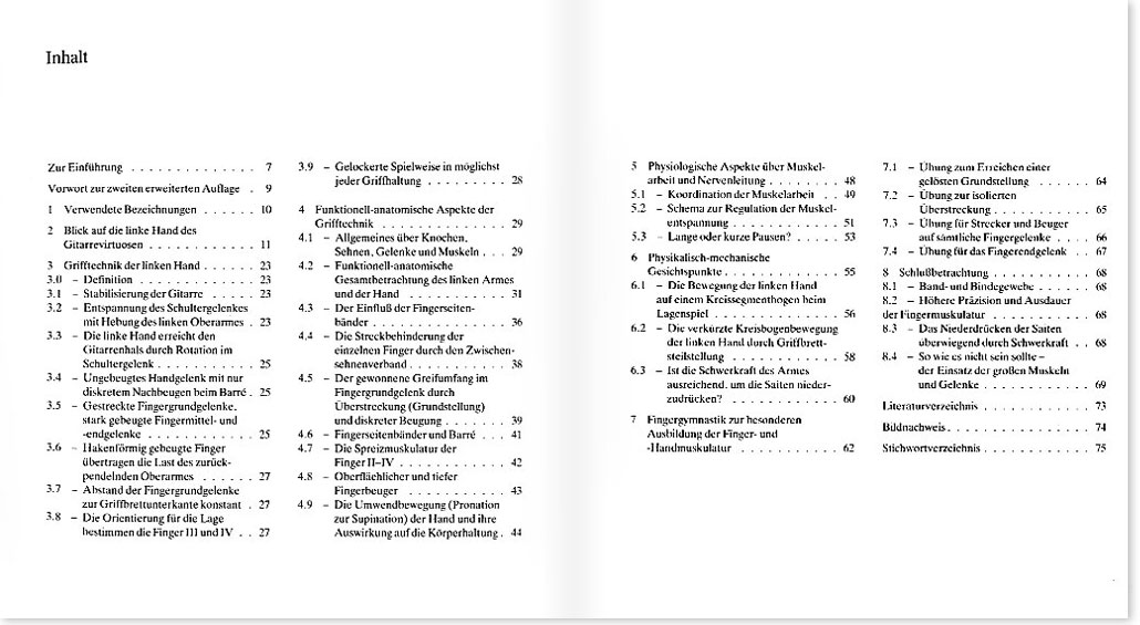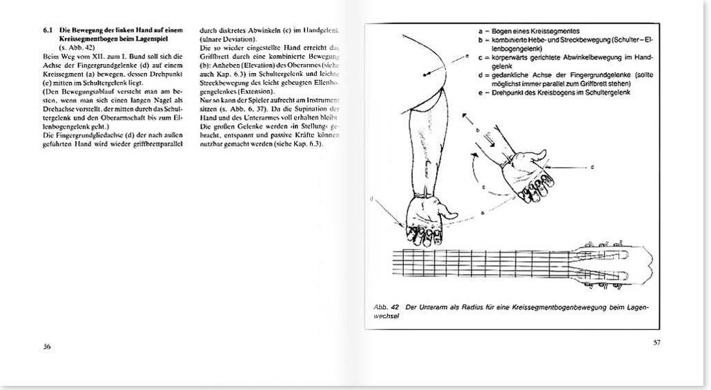 Manfred Bartusch erläutert in seiner Untersuchung die anatomischen Gegebenheiten, physiologische Abläufe im Nerv-Muskel-Regelkreis und versucht daraus Rückschlüsse auf die Ausbildung der linken Hand von Gitarristen zu ziehen. Er kommt dabei zu ganz außerordentlichen Ergebnissen und Überlegungen, die empirisch nur bestätigt werden können. So etwa betont und schreibt Bartusch präzis und mit zwingender Logik den Einsatz des Gewichts des linken Arms. „Allein das Eigengewicht eines passiv zurückpendelnden Armes reicht aus um vier Gitarresaiten in jeder Lage niederzudrücken.“ Auch entwickelt Bartusch eine spezielle Gymnastik für die linke Hand. Leider wurden bisher in keiner Gitarrenschule auch nur ansatzweise die Zusammenhänge dargestellt, die Bartusch so klar und exakt vermittelt.